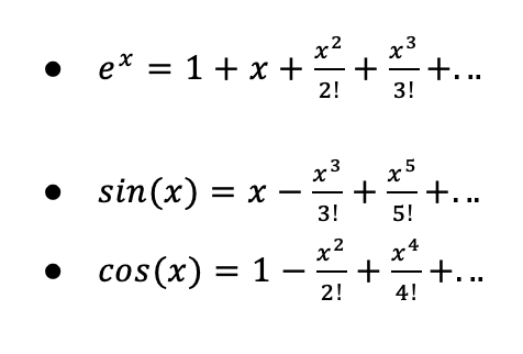 像是 eˣ 、sin x、ln(1 + x) 图像很弯绕,我们如果想算函数值y的时候 直接代x value进去好像有点难算,那么我们可以用泰勒级数,把它们拆成一长串很规则的近似,n越大可以理解成越多项越精确,就像这样: